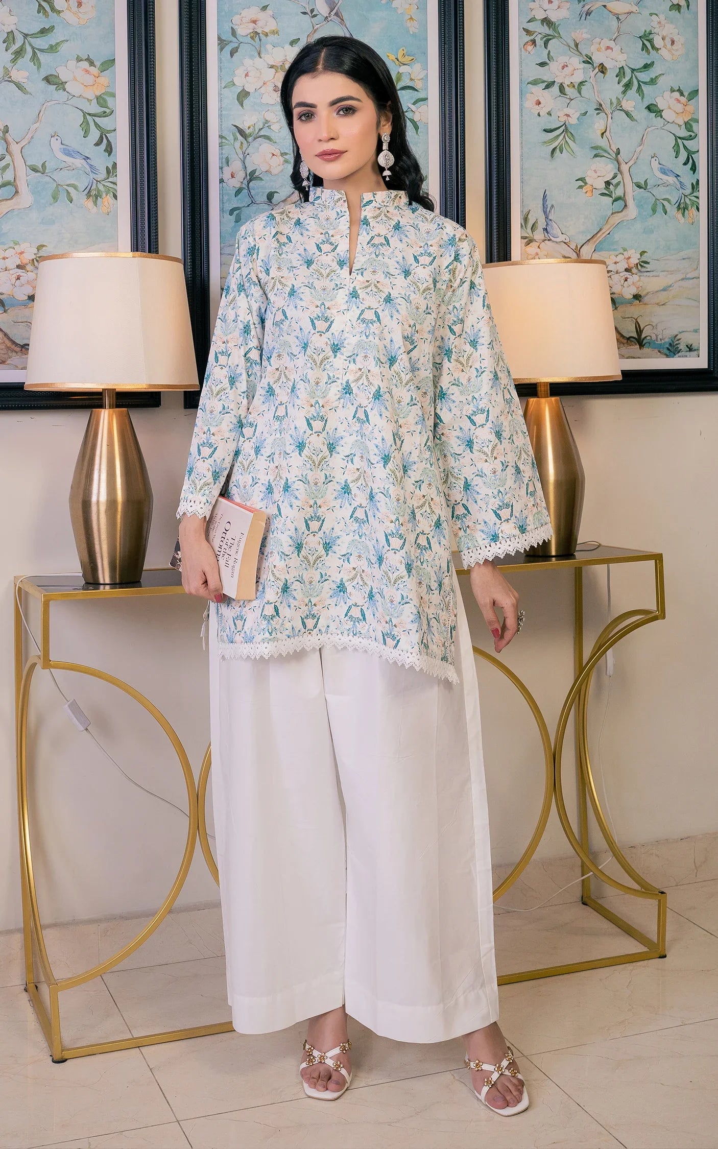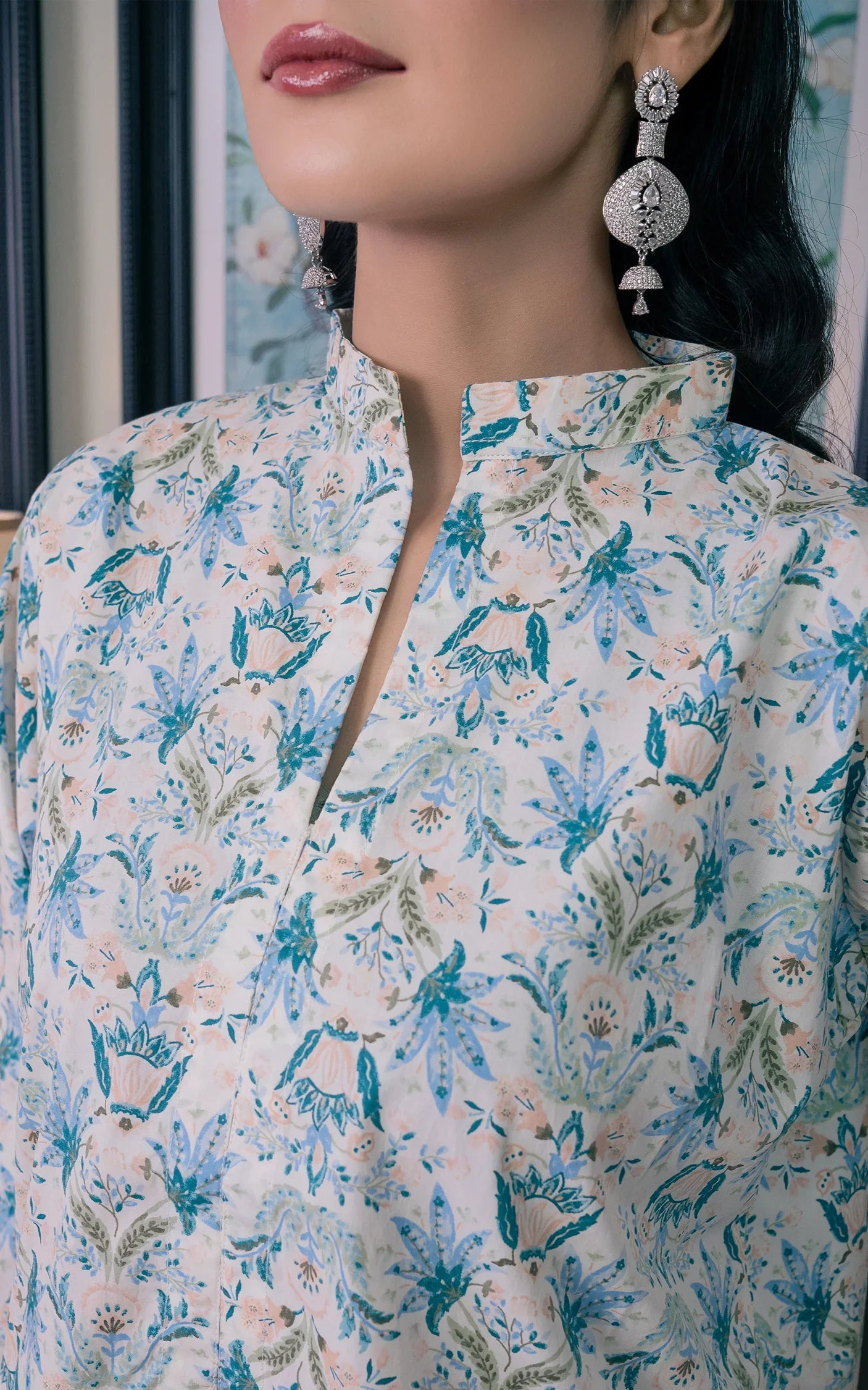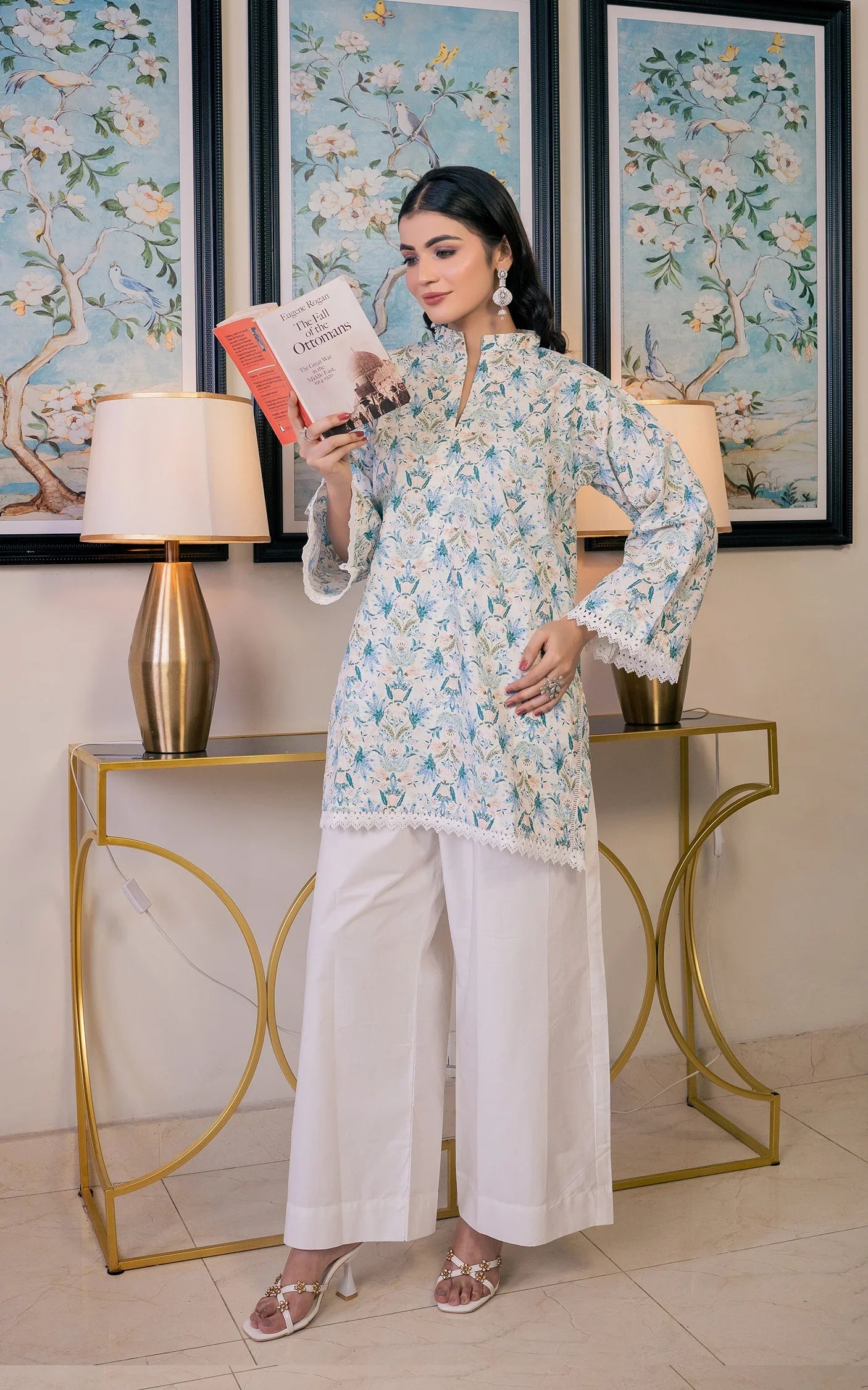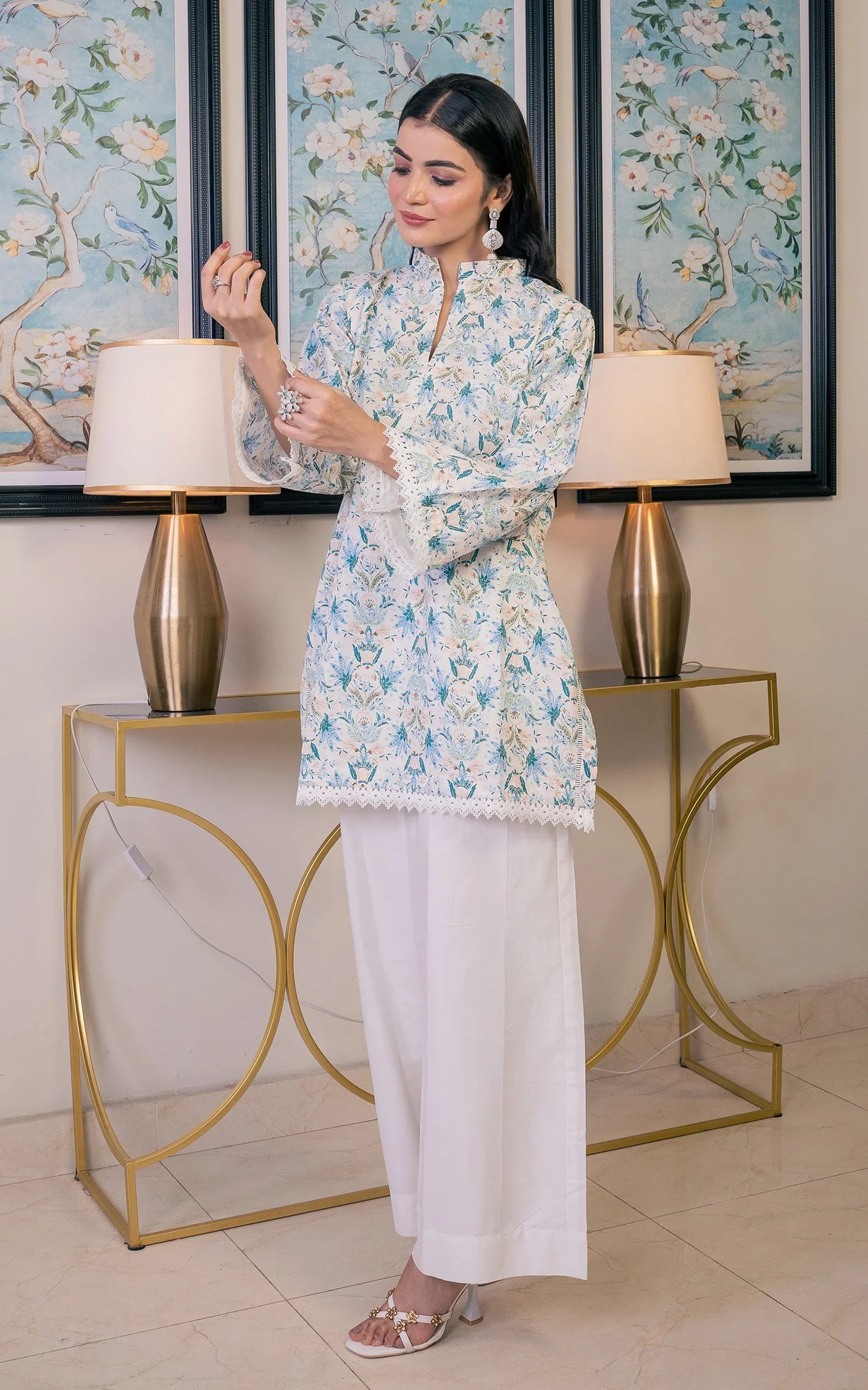 Fresh and graceful, the Bluebell charm Kurta Set pairs a breezy white trouser with a printed kurta in soft blue and teal floral motifs. The design is elevated with intricate lace detailing along the daman, near the side slits, and on the sleeves, adding delicate texture to the airy silhouette. A beautifully finished neckline completes the look, making it perfect for daytime elegance or casual gatherings.