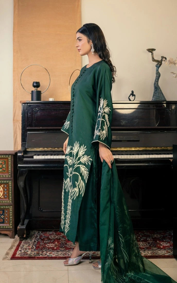 Step into timeless elegance with this deep emerald silk long shirt, detailed with chic side panels along the chest for a flattering silhouette. Intricate white palm tree embroidery graces the hem and bell sleeves, while a row of fabric-covered buttons runs down the front, ending in a subtle slit. Wide bell sleeves lend graceful movement, and the airy printed organza dupatta completes the look with sheer sophistication. Perfect for festive gatherings or evening soirées, this ensemble is where luxury meets effortless style.