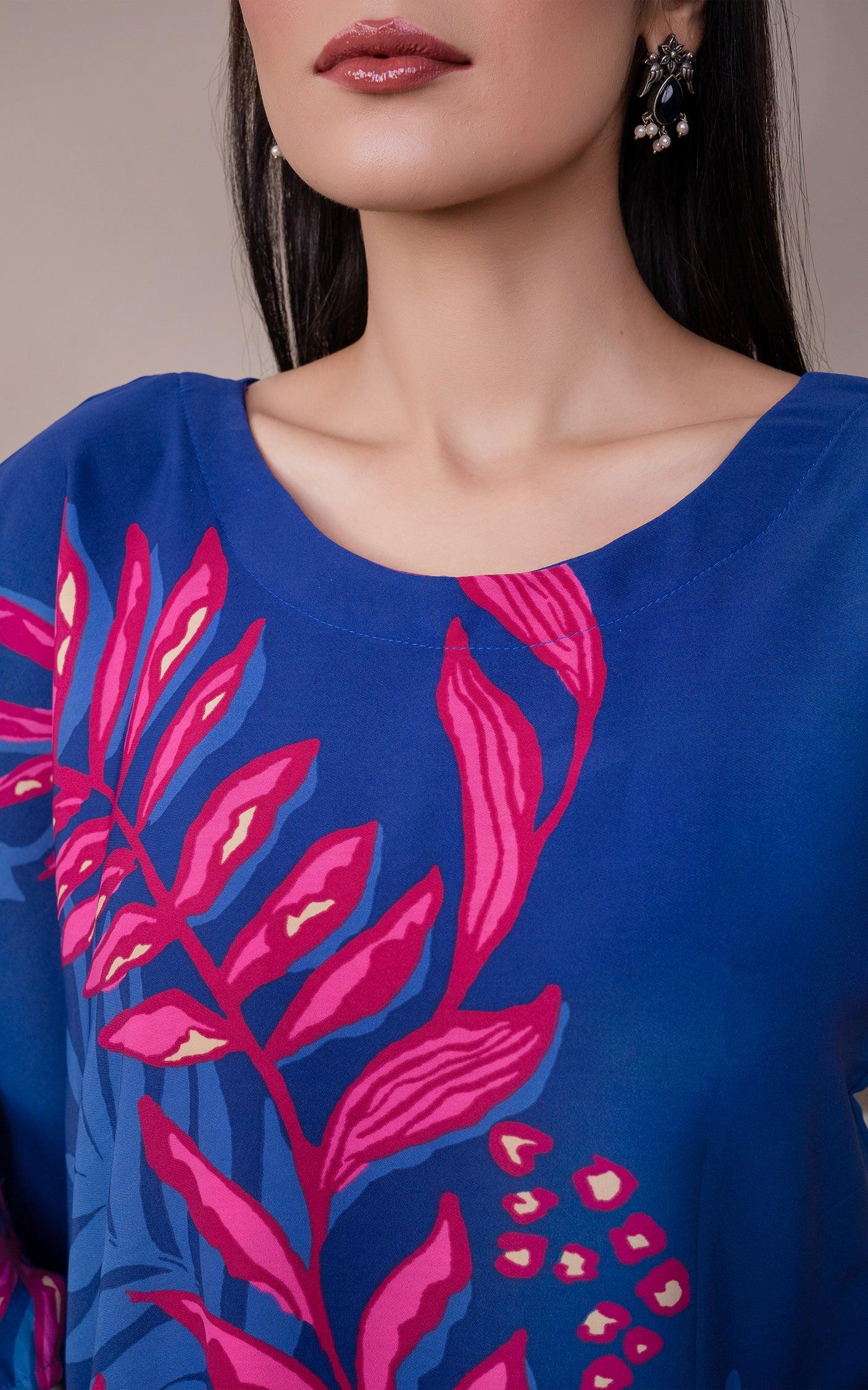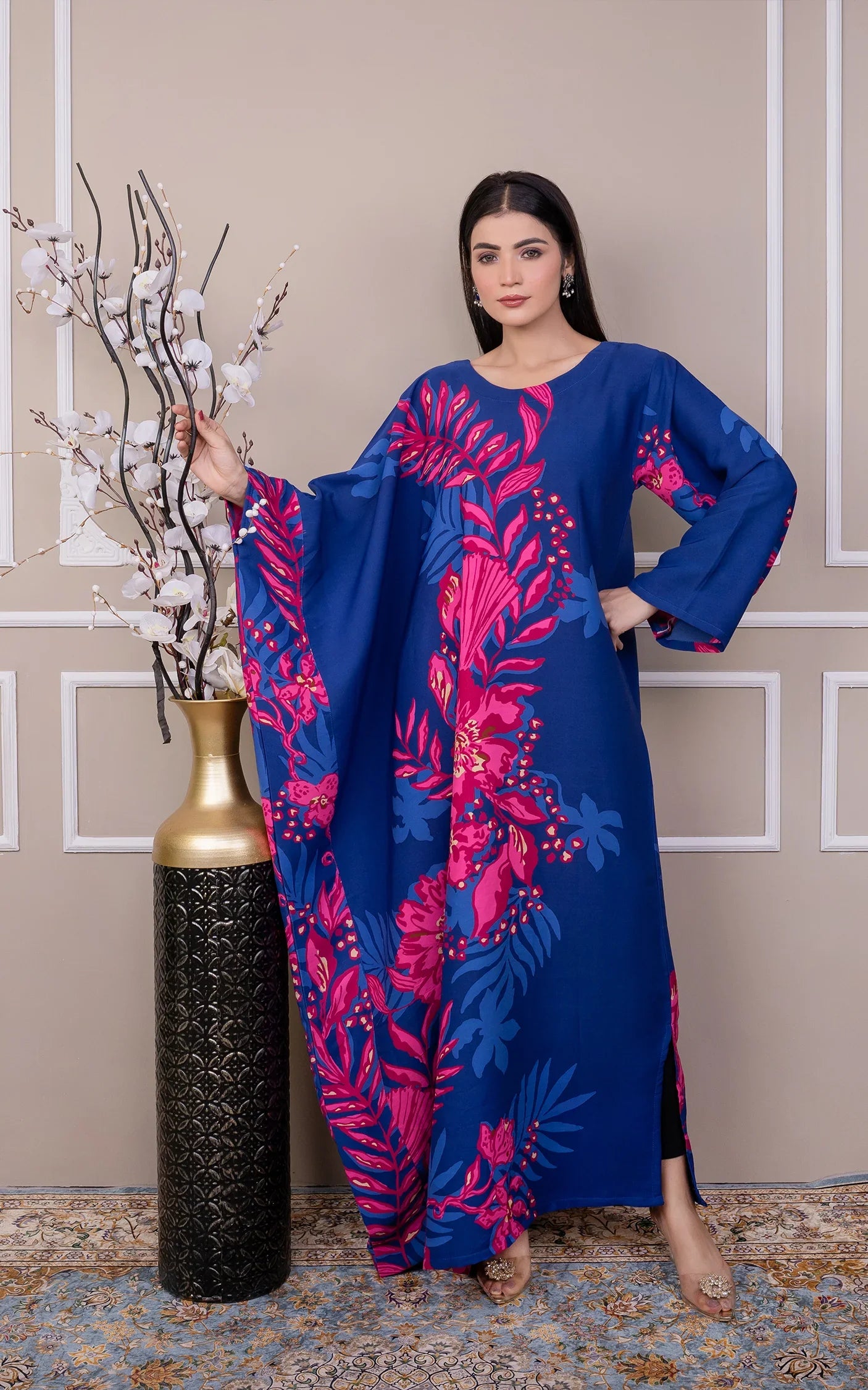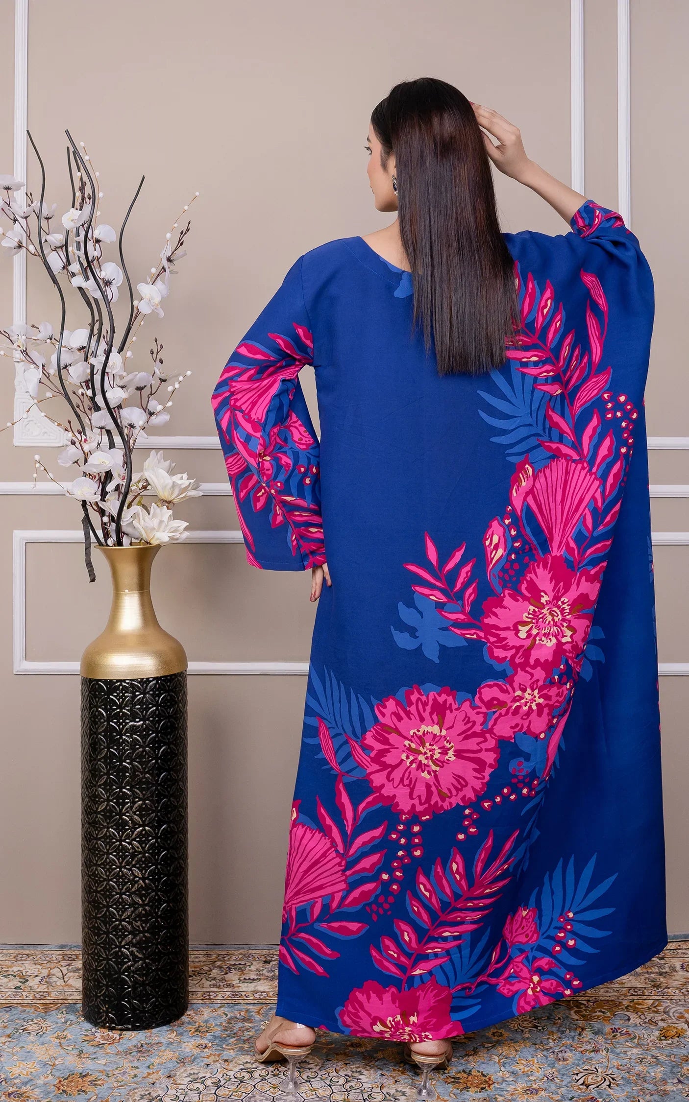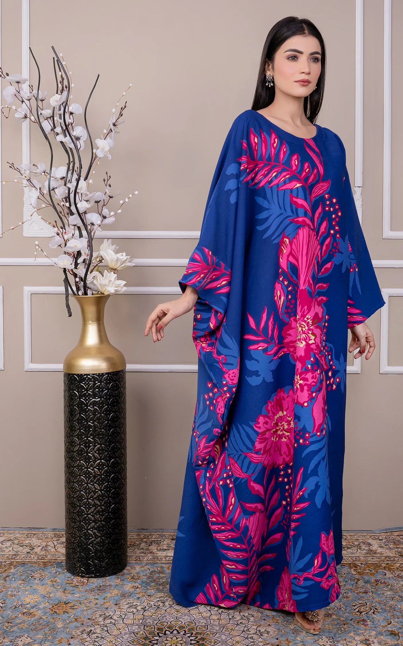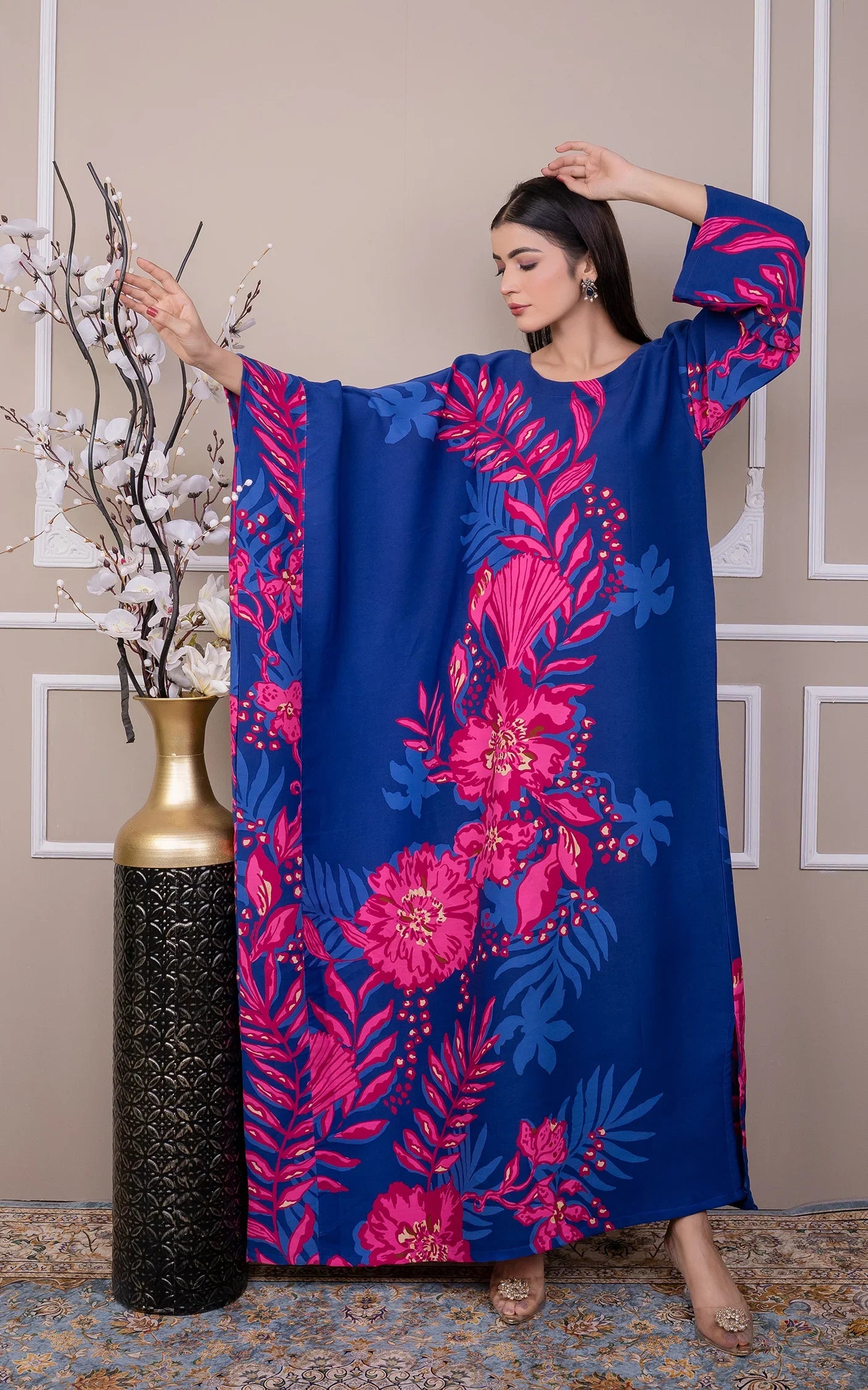 Drape yourself in seasonal elegance with this deep blue winter-crepe kaftan, designed for both warmth and effortless flow. A striking cascade of fuchsia and magenta florals blooms along one side, creating a bold asymmetrical statement. The fabric’s soft drape and gentle texture bring cozy comfort, while the wide sleeves and relaxed cut ensure ease of movement. Perfect for winter evenings, festive gatherings, or making a vibrant statement on chilly days.